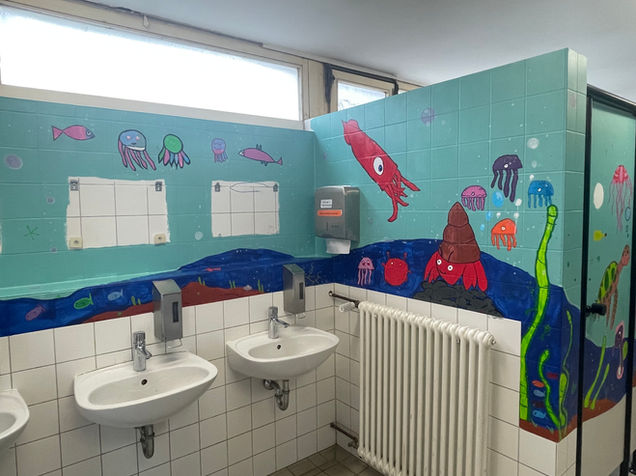 Vom 13.04. bis 17.04.2026 verwandelten sich unsere Mädchentoiletten in eine Unterwasserwelt.