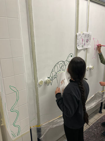 Ab dem dritten Tag stand das Ausmalen im Mittelpunkt: Mit viel Sorgfalt und Teamarbeit wurden die Umrisse ausgefüllt und die Details ausgearbeitet. Bis zum Ende der Woche verwandelten sich die Mädchentoiletten so in eine lebendige, bunte Unterwasserwelt, die nun alle Besucherinnen begeistert.